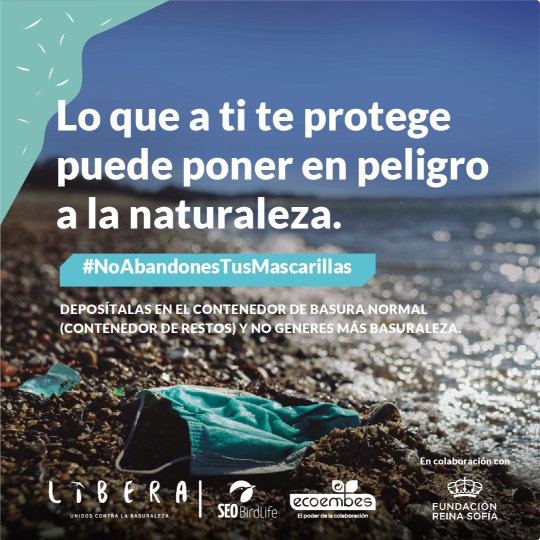 Tras el fin del estado de alarma desde el Proyecto LIBERA se solicita a la población que reflexione sobre la importancia de no solo proteger la salud personal y de la de terceras personas, sino hacerlo igualmente con la del planeta. La situación ha generado la utilización masiva de mascarillas por parte de la población siendo productos que, por su uso, no pueden ser reutilizados. Por ello con esta campaña pedimos a la sociedad responsabilidad absoluta ante este nuevo residuo, para que acabe en la papelera de la calle o contenedor de resto de sus casas y no abandonado. ¿Quieres colaborar? ¡Descarga los materiales y ayúdanos a difundir!